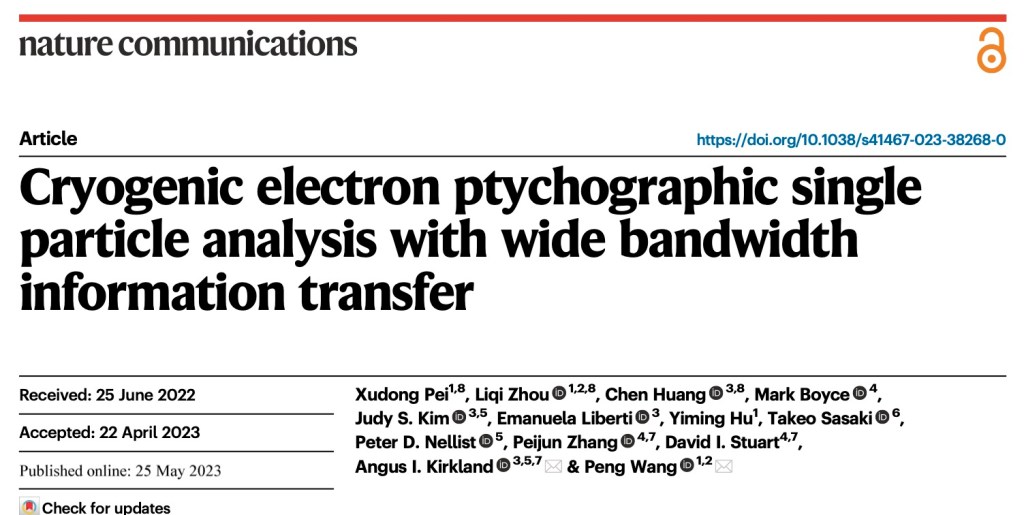 Many Congratulations to Xudong Pei, and coauthors! We would like to thank tremendous contributions from our collaborators to this work. The paper of Cryogenic electron ptychographic single particle analysis with wide bandwidth information transfer Xudong Pei1#, Liqi Zhou1,2#, Chen Huang3#, Mark Boyce4, Judy S. Kim3,5, Emanuela Liberti3, Yiming Hu1, Takeo Sasaki6, Peter D. Nellist5, Peijun Zhang4,7,, David I. Stuart4,7,Angus I. Kirkland3,5,7* and Peng Wang1,2* has been accepted by Nature Communications, 2023 May and is on line now.