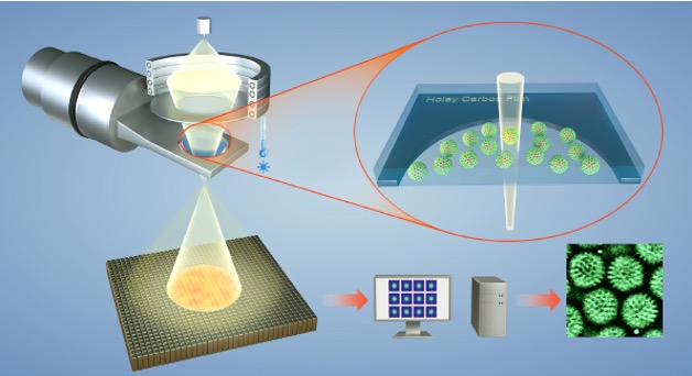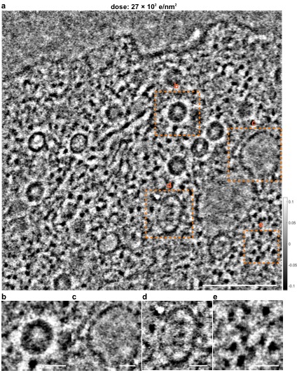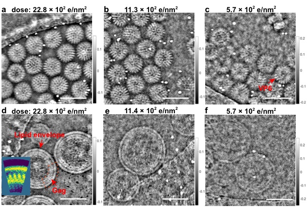 In this paper, we, for the very first time demonstrate that electron ptychography can recover the phase of the specimen with continuous information transfer across a wide range of the spatial frequency spectrum, with improved transfer at lower spatial frequencies and as such is more efficient for phase recovery than conventional phase contrast imaging. We further show that the method can be used to study frozen-hydrated specimens of rotavirus double-layered particles and HIV-1 virus like particles under low-dose conditions (5.7 e/Å2) and heterogeneous objects in an Adenovirus-infected cell over large fields of view (1.14 × 1.14 μm) thus making it suitable for studies of many biologically important structures. Low-Dose Phase Retrieval of Biological Specimens using Cryo-Electron Ptychography